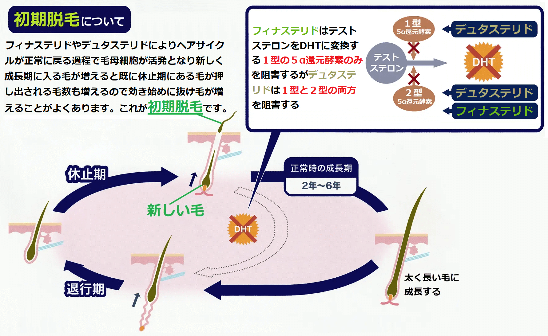 | 初期脱毛 | ヘアサイクルが正常に戻る過程で毛母細胞が活発となり新しく成長期に入る毛が多くなると既に休止期にある毛が押し出される数も多くなるため薬の効き始めに抜け毛が増える場合がよくあります。 |