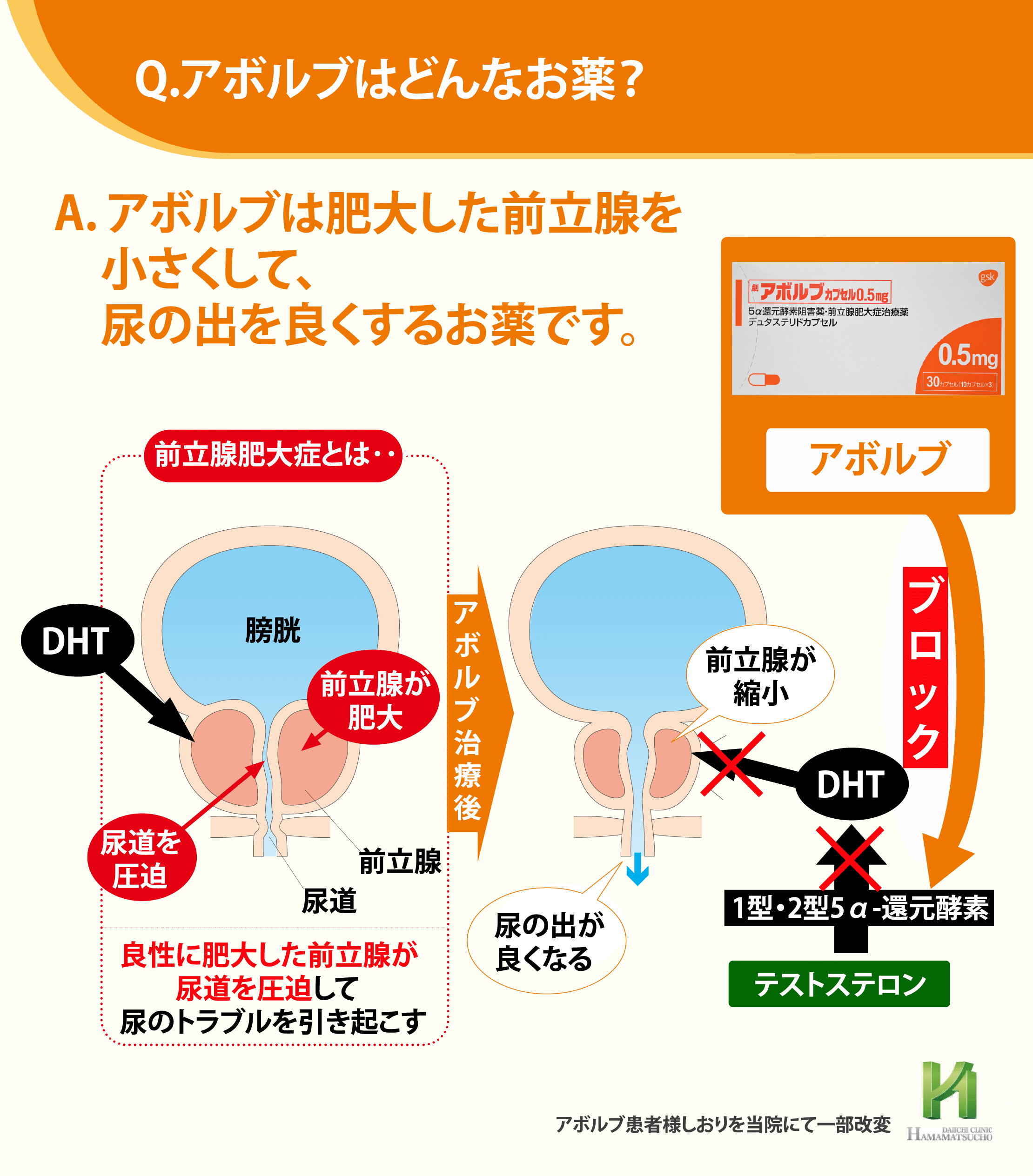 デュタステリドは前立腺肥大症の治療薬であるアボルブの有効成分でもあり、国内では「デュタステリドカプセルAV」「デュタステリド錠AV」がアボルブのジェネリック医薬品として各社から発売されています。それでは、前立腺肥大症(BPH)治療薬としてのデュタステリドの作用機序を解説していきます。