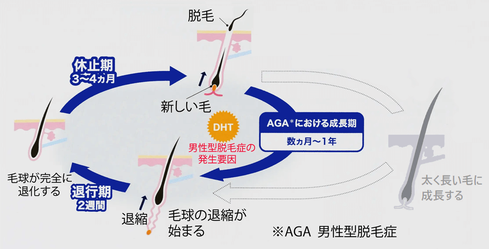 下の図のように男性型脱毛症(AGA)では、DHTなどの関与によりヘアサイクルの成長期が通常は2~6年程度ある期間が数ヶ月~1年と短くなり、髪の毛が十分に成長しないうちに抜け落ちたり硬毛が軟毛化することで薄毛が徐々に進行してしまうのです。