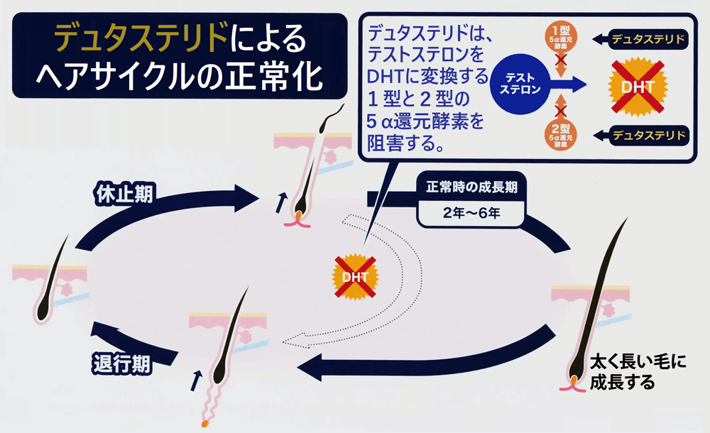 デュタステリドは、テステステロンをDHTへ変換する1型及び2型の5α還元酵素をともに阻害し、DHT濃度を低下させることでヘアサイクルの正常化を促し、毛髪数を増加させます。