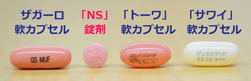 見た目で選ぶなら先発品であるザガーロは軟カプセル剤なので、同じく軟カプセルである「サワイ」「トーワ」でしょう。軟カプセルは大きいので飲み難いと感じている方は、画像の通りコンパクトで服用し易い錠剤タイプの「NS」がお勧めです。前項の比較表にも剤形を表示しているのでご参照ください。