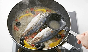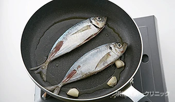 あじはうろこ、ゼイゴ、エラ、内臓を取り除き、血合いをよく洗い流す。しっかり水気をふきとり、塩・こしょうで下味をつける。