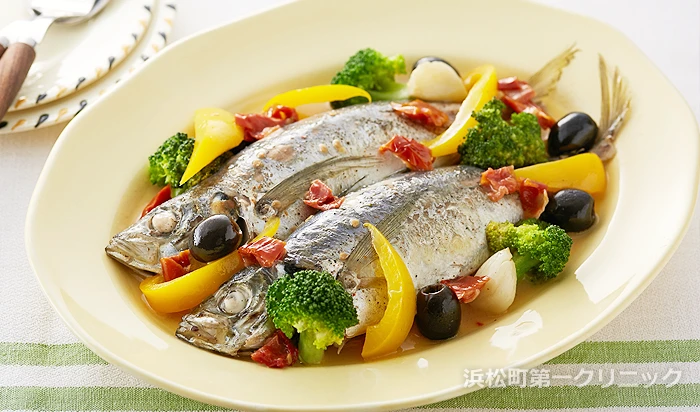 青背魚のあじは、不飽和脂肪酸である EPA と DHA が豊富。血液サラサラ効果が期待できます。これらは酸化されやすいので、抗酸化作用のある緑黄色野菜と合わせて食べるのがおすすめです。