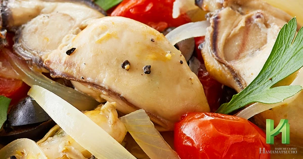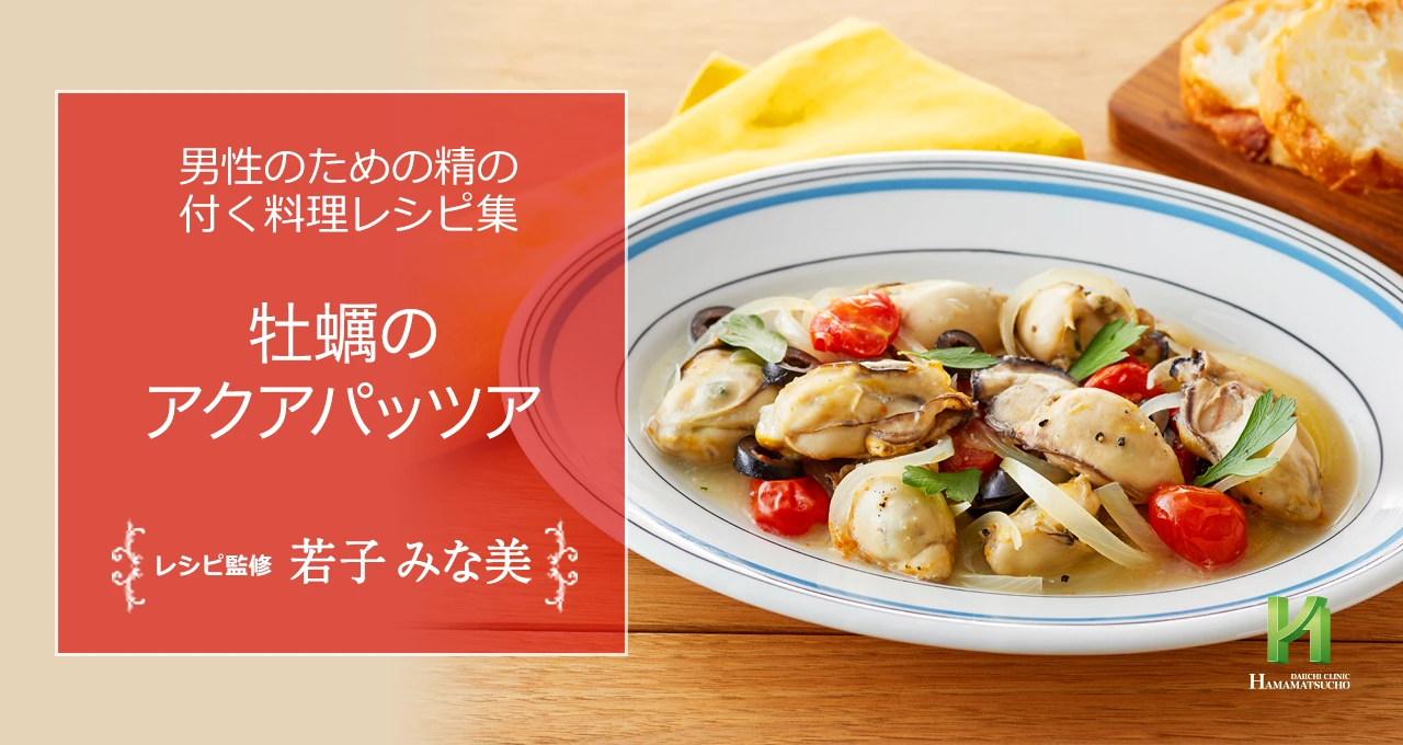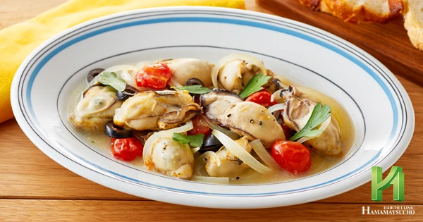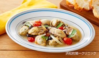 亜鉛が豊富に含まれる牡蠣に、ビタミンCが含まれるミニトマトや玉ねぎを合わせてアクアパッツァに。紅白の彩りは新年のお祝いにもおすすめ。