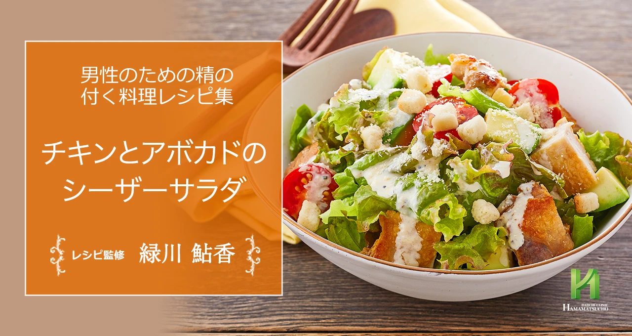 居酒屋の定番「シーザーサラダ」。チキンとアボカドを加え、食べ応えのあるおつまみサラダに。ドレッシングも冷蔵庫にある調味料で簡単に作れます。