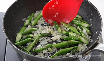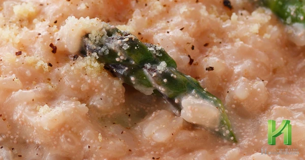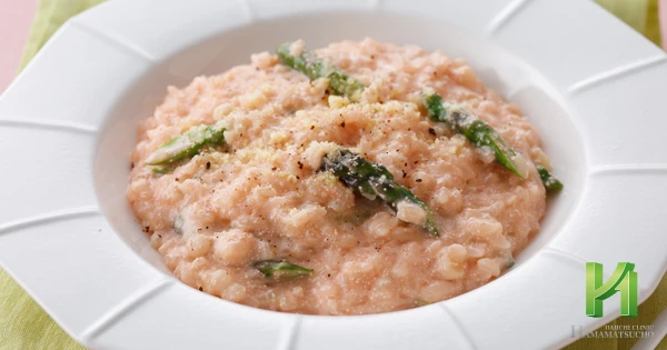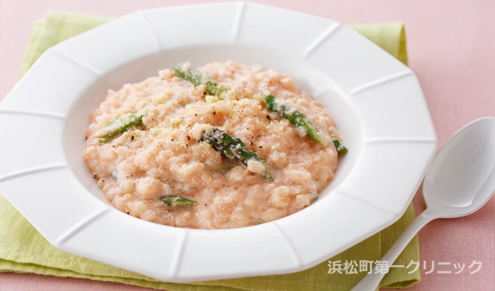 ピンクと緑で春色リゾット。和風のおだしでやさしい味の仕上がりに。