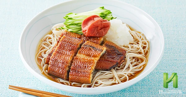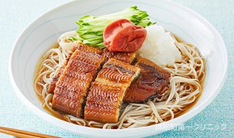ビタミン類が豊富なうなぎと消化を助ける酵素が含まれる大根を合わせてぶっかけそばに。梅干しを崩しつつ味を変えながら楽しんで食べるのが◎。