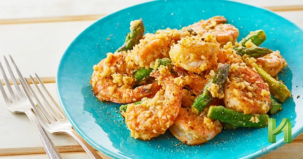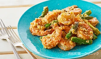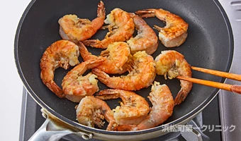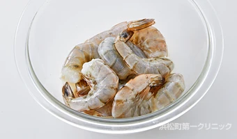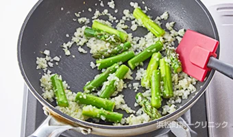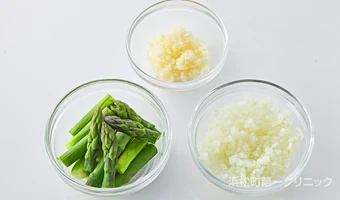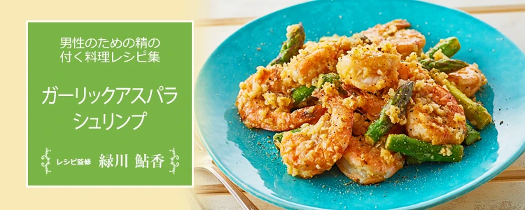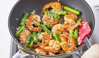 アスパラギン酸が豊富なアスパラガス。ガーリックシュリンプに合わせて疲労回復メニューに。レモンを搾ることでさっぱりといただけて、ミネラルの吸収もアップ!