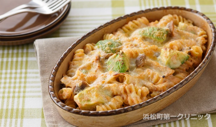味付けは明太子のみのお手軽グラタン。アボカドを入れて食べ応えUP!フィジッリの他にペンネでも。
