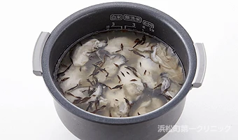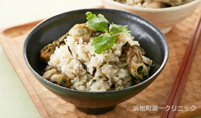 亜鉛といえば牡蠣。炊き込みご飯にすることで、無駄なく栄養を摂取できます。ひじきを加えて食物繊維の補給に、生姜を加えることで風味良く、身体を温める効果も。