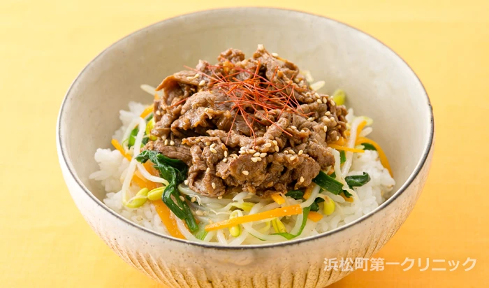 亜鉛が豊富な牛肉と胡麻を使って韓国風丼。胡麻油で和えることで食欲そそり、野菜に含まれるカロチンの吸収も UP。