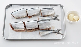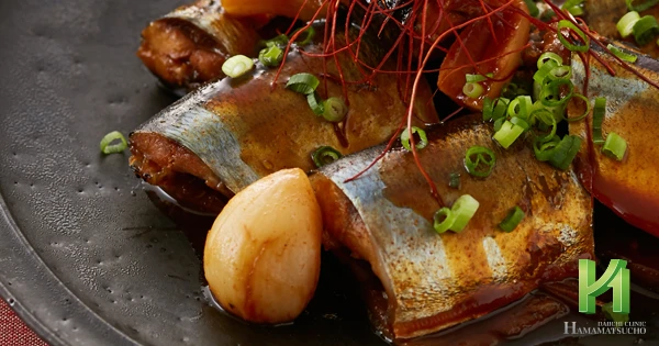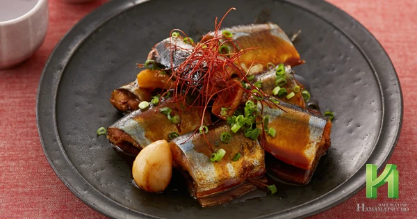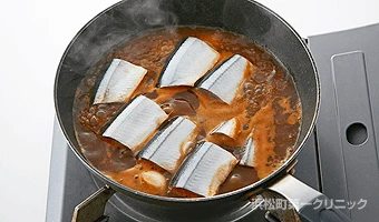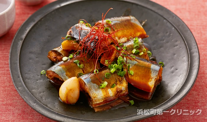 青背魚の秋刀魚の脂には EPA や DHA が豊富。煮汁までいただくことで無駄なく摂取できます。にんにくを加えて風味よく、ねぎをちらしてスタミナアップ。ピリ辛味でごはんのすすむメニューです。