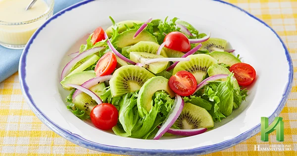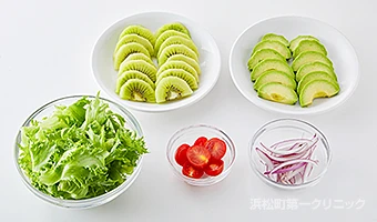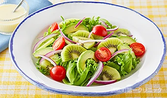 キウイ 1 個には約 60 mg ものビタミン C が含まれています。野菜と一緒にサラダにすると、おかずとしても食べることができます。ほんのり甘いヨーグルトドレッシングがキウイと相性◎。