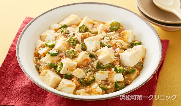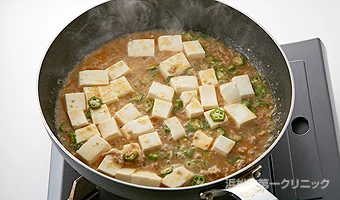 いつもの麻婆豆腐にオクラを加え、カロテンや食物繊維をプラス。また、お肉の半量をオクラに変えることでカロリーダウンにもつながります。咀嚼回数も増え、消化にも優しいメニューです。