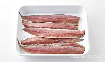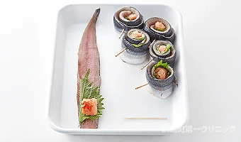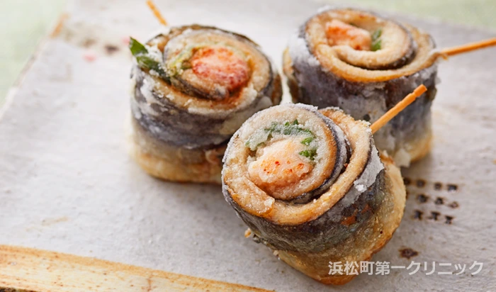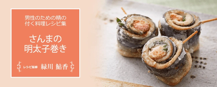 明太子と大葉をさんまで巻いた、お酒やご飯が進む贅沢おかず。さんまには、血液をサラサラにする EPA や DHA が多く含まれます。明太子はビタミン E を多く含み、活性酸素の害から体を守ります。
