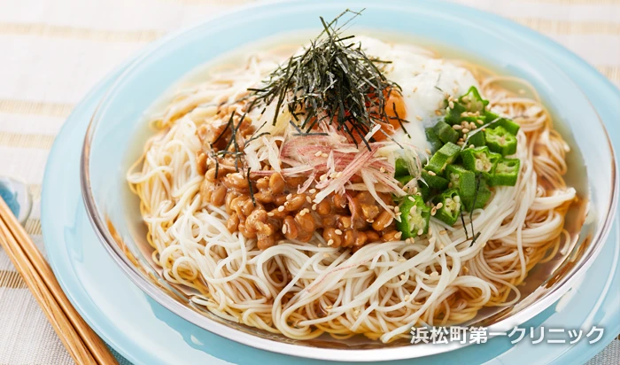 おくらや長いものネバネバ成分は、胃の粘膜を保護し、血糖値の上昇を抑えてくれます。納豆はビタミン B2 が豊富で、脂質と糖質の代謝をサポート。ダイエット中にもおすすめの組み合わせです。