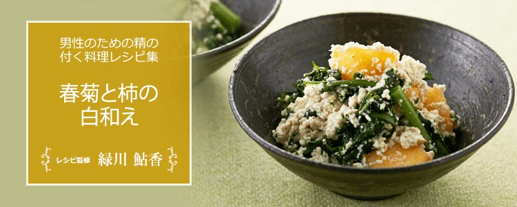 春菊はβカロテン、柿はビタミン C を多く含み、風邪予防に効果的な組み合わせです。ほろ苦い春菊と甘い柿がよく合います。メインの肉、魚料理の副菜におすすめです。