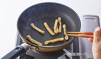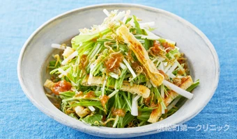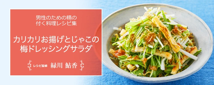 カリカリのじゃこにサクサクの油揚げ、シャキシャキの野菜を合わせた食感の楽しいサラダ。ドレッシングに梅干しをプラスしてさっぱりいただけます。梅干しに含まれるクエン酸は疲労回復の手助けをしてくれます。