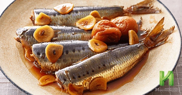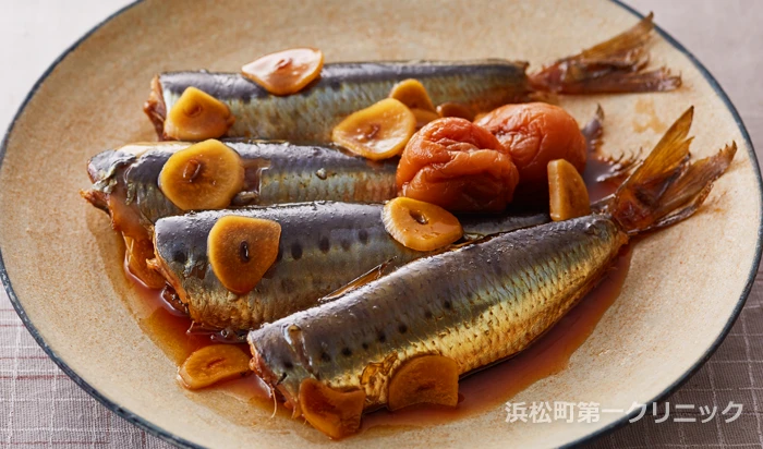にんにくと梅干しを一緒に煮ることで魚の臭みをやわらげ、コクのある味わいに。いわしには、血液をサラサラにする EPA や DHA が豊富。梅干しに含まれるクエン酸は疲労回復にも役立ちます。