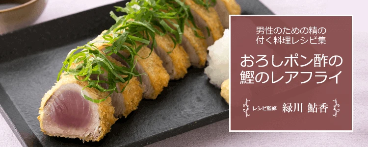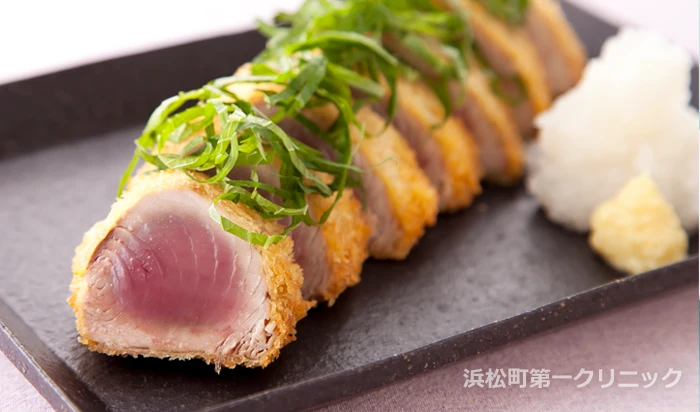 ビタミン B1、セレンが豊富な鰹ににんにくで下味をつけてスタミナ UP と、ビタミン C が豊富な大根おろしを添えて抗酸化力も UP。