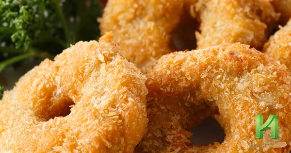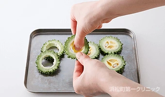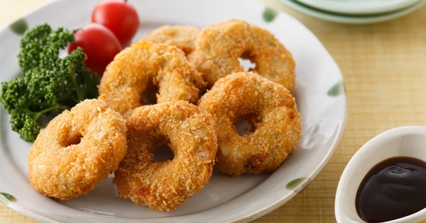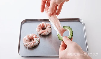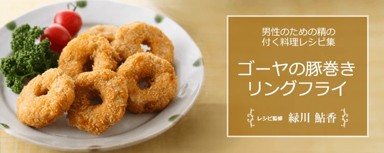 輪切りのゴーヤに下味を付けた豚の薄切り肉を巻いて小麦粉を付け卵と粉チーズを混ぜ合わせたものにくぐらせてパン粉を付けて揚げるだけの簡単イカリング風のフライの完成。ソースを付けてお召し上がり下さい。