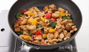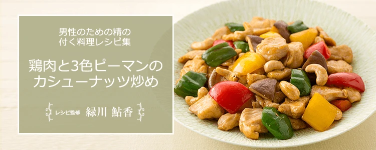 アルギニンが豊富な胸肉と亜鉛が豊富なカシューナッツと合わせて炒め物。3 種ピーマンに含まれる豊富なビタミン C が亜鉛の吸収を UP。