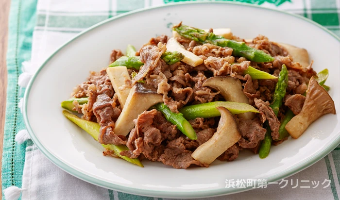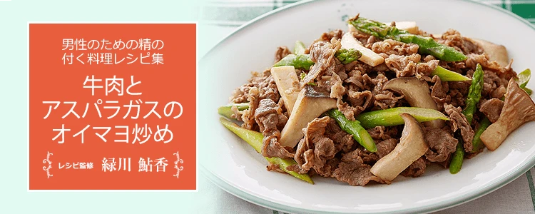 オイスターソースとマヨネーズで味付けをした、こってり味のごはんがすすむおかずです。牛肉は、亜鉛が豊富な赤身の部位を選ぶのがおすすめ。アスパラガスはアスパラギン酸を多く含み、疲労回復・滋養強壮に役立ちます。