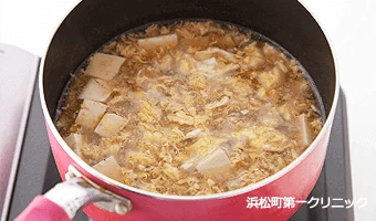 蟹缶を汁ごと使うことで旨みが加わり、汁に流出したタウリンなどの栄養素を無駄なく摂取できる。卵と豆腐の良質なたんぱく質に、亜鉛が豊富なカニほぐしみ缶をプラス。汁ごと飲み干せるのも◎