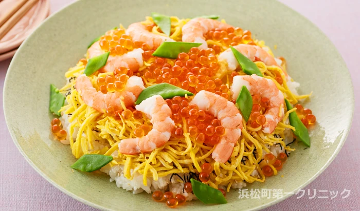 えびは低脂肪・高たんぱくで、ダイエット中にもおすすめの食材。タウリンを多く含み、血中のコレステロールを減らす効果も。のせるだけで簡単かつ華やか!ひなまつりにおすすめのちらし寿司です。
