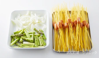 ウインナーにスパゲッティを差し込み、箸で食べられるユニークなナポリタン。アスパラガスをたっぷり加えてスタミナアップ!お弁当や休日のランチにもおすすめです。