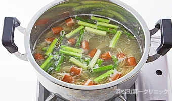 スパゲッティはウインナーの塩分で茹でます(減塩ポイント)。
