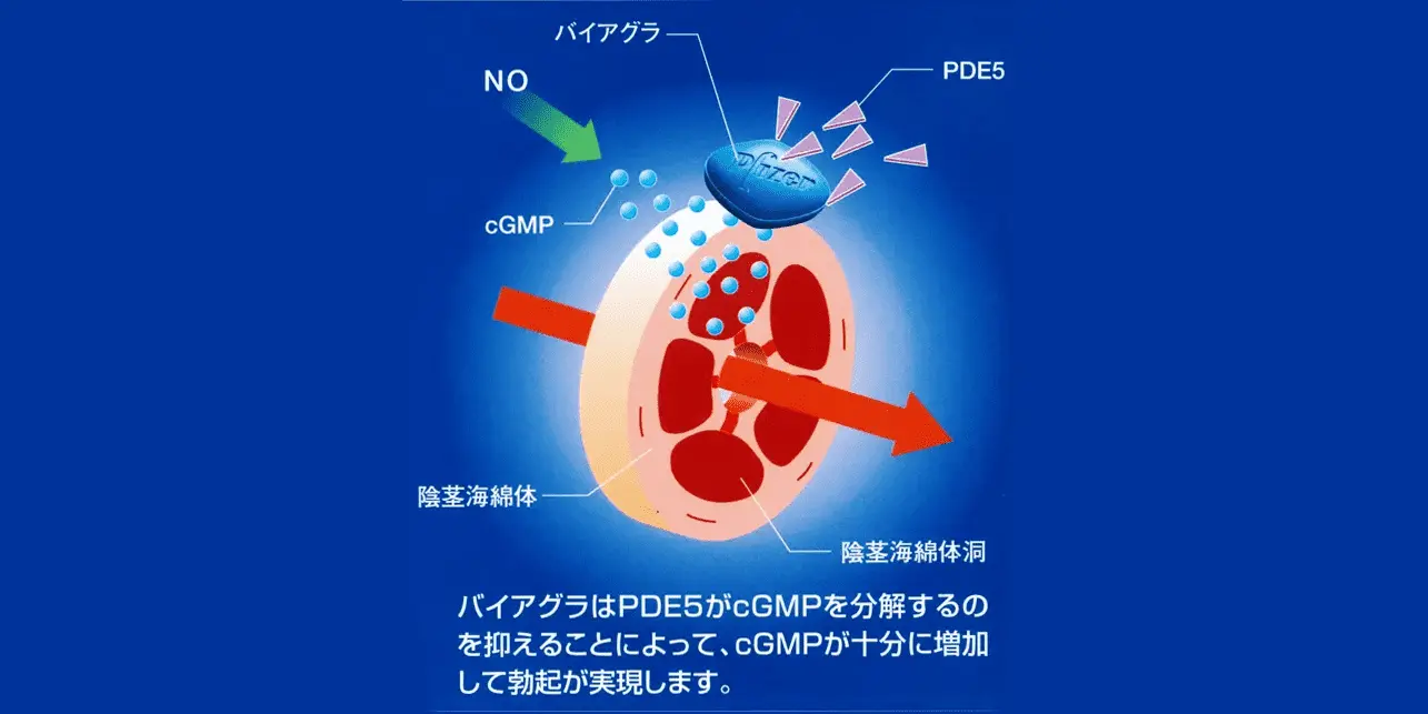 - シルデナフィルはcGMP分解酵素であるPDE5を阻害することでcGMP濃度を高め勃起の補助をするのです。しかし、射精後や、性的興奮がしずまった後はNOの放出も止まり、cGMPも生成されなくなるのでシルデナフィル摂取後でもPDE5が優位となり勃起は収まります。